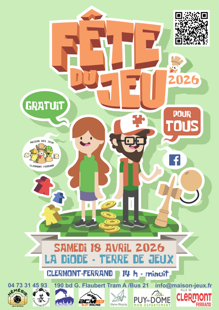 La Maison des Jeux vous invite le samedi 18 avril 2026 pour la 22e édition de la Fête du Jeu à Terre de Jeux au 190 boulevard Gustave Flaubert à Clermont-Ferrand (derrière Litrimarché), de 14 h à minuit.